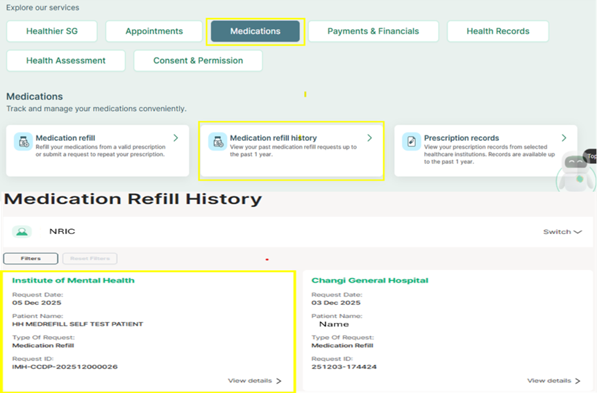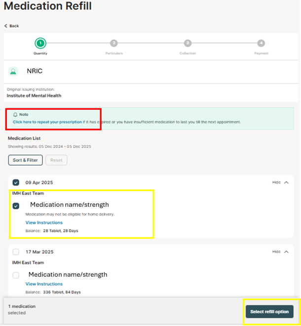 1. Log in to HealthHub with your Singpass, select ‘Medication’ followed by ‘Medication refill’.