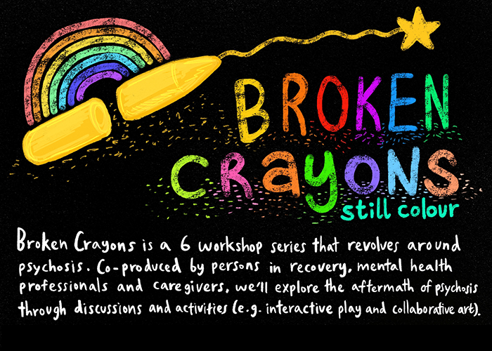 Anyone with an interest in psychosis is welcome. Join us for the Broken Crayons workshop series to take home insights to help yourselves or others in recovery from psychosis!