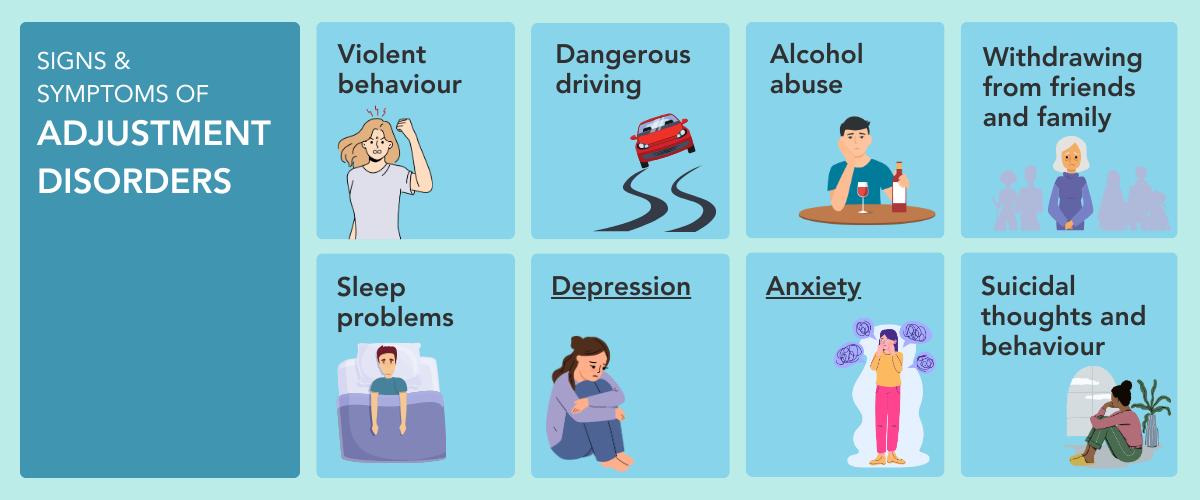 Adjustment disorders may take up to three months to show up after a stressor occurs. The symptoms can vary considerably, usually appearing as depressive or anxiety symptoms, and sometimes even both. Physical changes in behaviour are most common in children and the elderly, but this can happen in any age group.